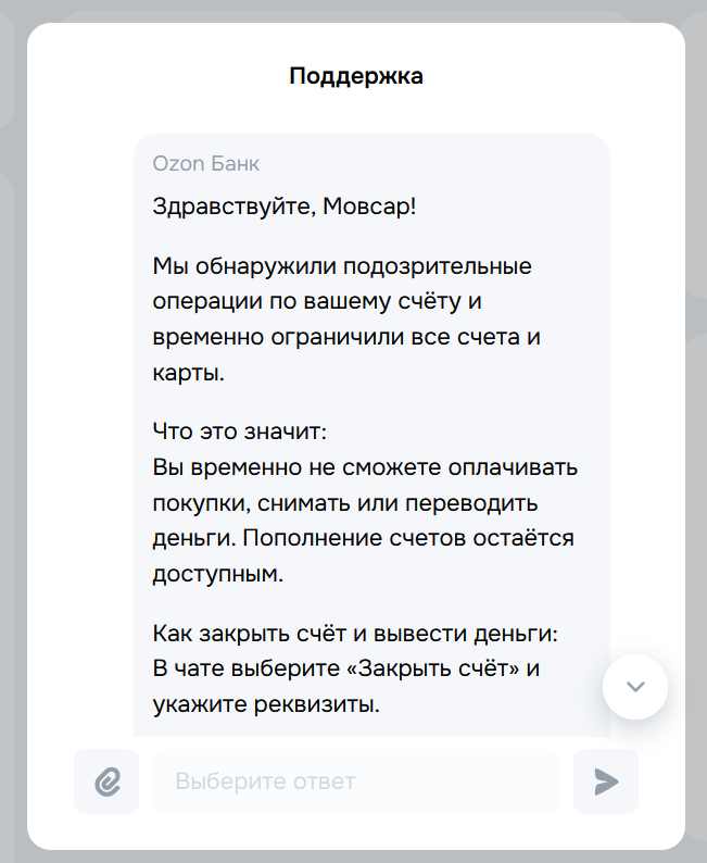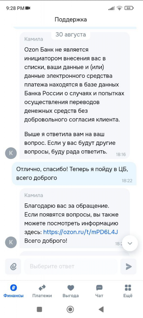 Далее начался цикл, растянувшийся на три месяца: я пытался получить от ОЗОН Банка подтверждение или опровержение того, являются ли они инициатором всего этого кошмара.