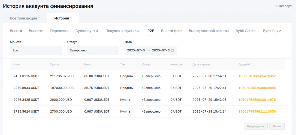 Так вот — «инцидент» с ОЗОН Банком у меня случился 29 июля 2025 года, когда я совершил P2P-сделки на криптовалютной бирже ByBit, чтобы перевести свои деньги со своего вышеупомянутого счёта на счета в России. Чтобы это сделать, я купил криптовалюту двумя переводами с TBC на $2 700 и $2 000, что можно увидеть в следующих ордерах на ByBit: