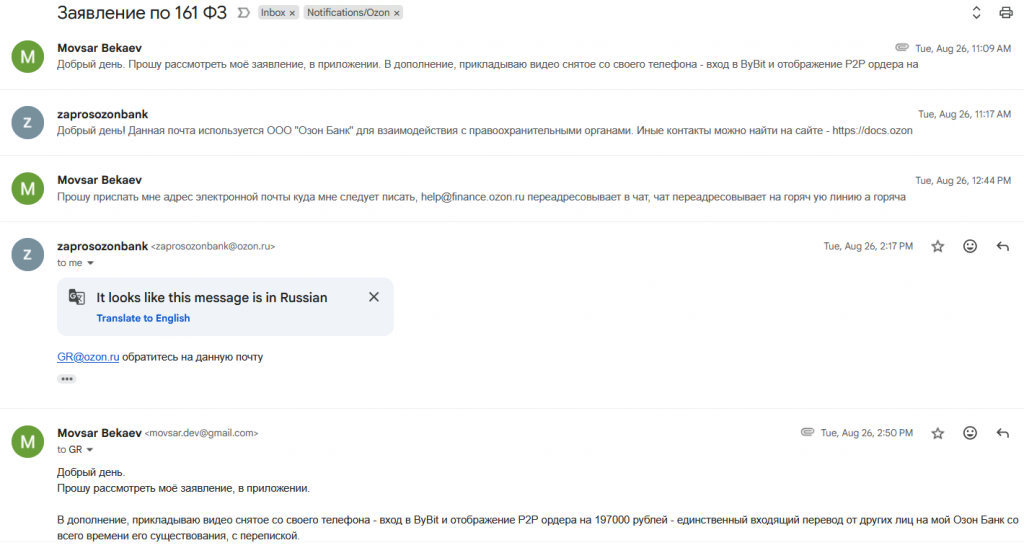 Примерно в середине всех этих разбирательств в Т-Банке мне сообщили, что данные обо мне в ЦБ передало МВД. Это стало ещё одной неожиданной новостью. Я обсудил это с юристом, который время от времени помогал мне составлять различные заявления — бесполезные, как оказалось. Он сказал, что нужно точно выяснить, кто является инициатором, чтобы подать на него в суд: либо МВД, либо ОЗОН. ЦБ утверждает, что инициатор — ОЗОН, а Т-Банк — что МВД. МВД пишет чтобы я обращался в ЦБ.